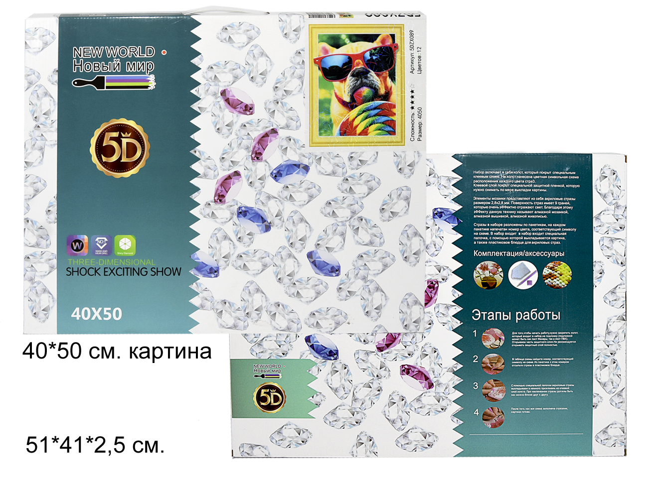 Алмазная мозаика арт. 089-5D Собака в очках в кор. полная выкладкаВ набор входит: инструкция, специальный инструмент "ручка" для установки алмазов, холст с изображением картины на подрамнике, с клеевым покрытием, стразы в специальных пакетиках по номерам соответствующих цвету, клей для приклеивания страз, лоток для страз.