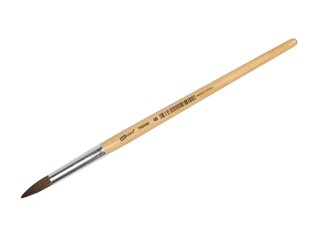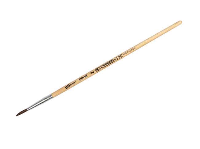 - Кисть художественная круглая Пони №05 "Art Space", арт.PH5_2378 (1/25) PH5_2378×Кисть художественная круглая Пони №05 "Art Space", арт.PH5_2378 (1/25) PH5_2378Художественные кисти ArtSpace изготовлены из волоса пони. Он несколько толще, чем у белки, расстояние между волосками больше, поэтому воду такая кисточка набирает меньше, чем из белки или колонка. Приобретают форму конуса, не слишком упруги. Кисть круглой формы с короткой ручкой из дерева идеальна для начинающих художников, поэтому её часто используют в детских образовательных учреждениях.