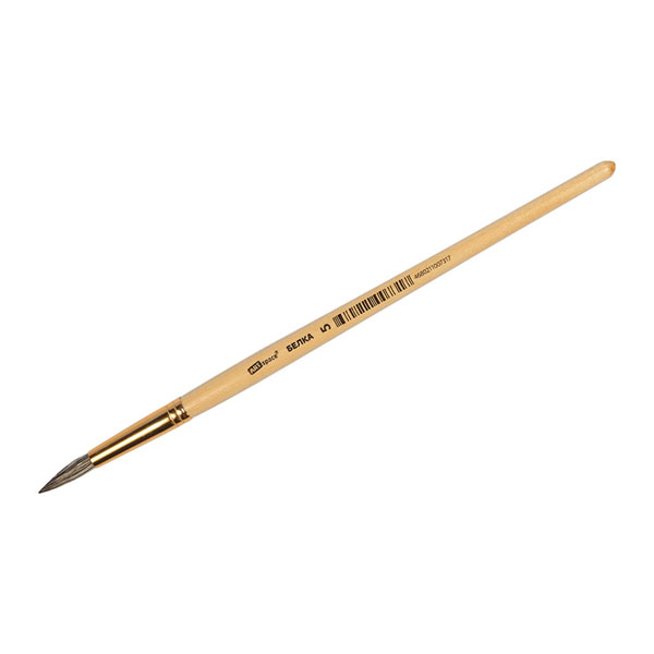 Круглая кисть №05 позволяет создавать на белом листе удивительные картины и образы. Она выполнена из волоса белки. Изделие имеет длинную деревянную ручку и металлическую обойму.