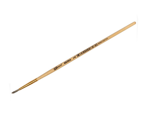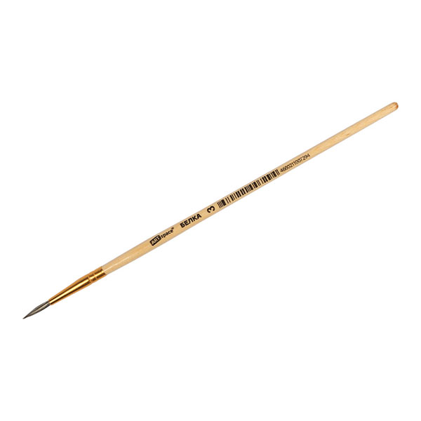 Круглая кисть №03 позволяет создавать на белом листе удивительные картины и образы. Она выполнена из волоса белки. Изделие имеет длинную деревянную ручку и металлическую обойму.
