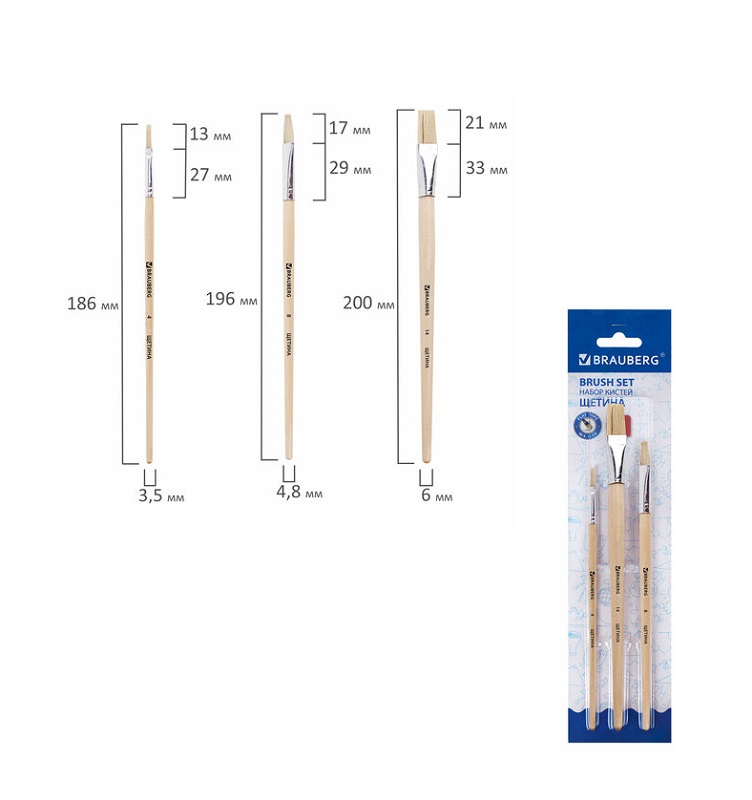 - кс_Кисти арт. 200223 BRAUBERG, набор 3 шт. (щетина, плоские № 4, 8, 14), блистер×кс_Кисти арт. 200223 BRAUBERG, набор 3 шт. (щетина, плоские № 4, 8, 14), блистерНабор из трех кистей разного размера позволяет начинающим художникам решать любые творческие задачи в детском саду, школе и дома. Кисти из щетины обладают высокой упругостью, хорошо держат форму, долговечны и надежны. Благодаря кисти №4 ребенку будет комфортно прорисовывать контуры. Кисти №8 и 14 позволят делать более крупные мазки и линии. Деревянную лакированную рукоятку кисти удобно держать в руке.