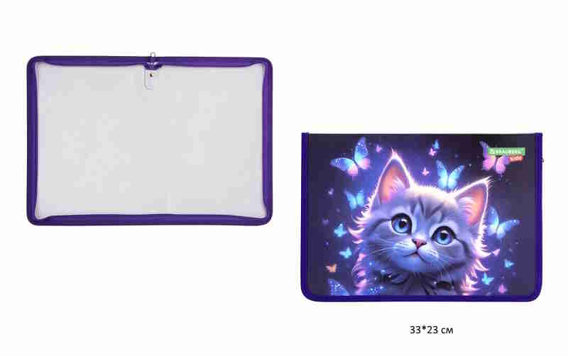 кс_Папка для тетрадей арт. 273336 BRAUBERG KIDS А4, 1 отделение пластик, молния вокруг "Curious cat"