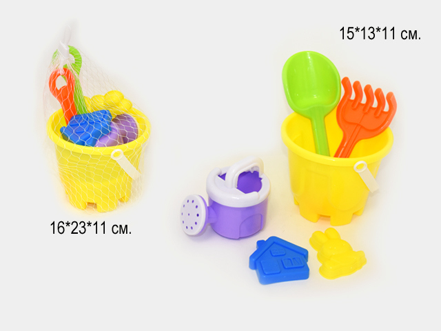 Песочный набор арт. 2029-802 Ведро, лопата, лейка, формочки в сетке