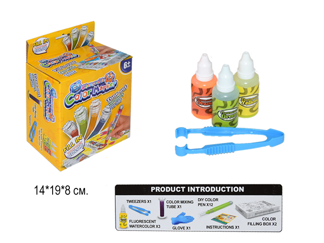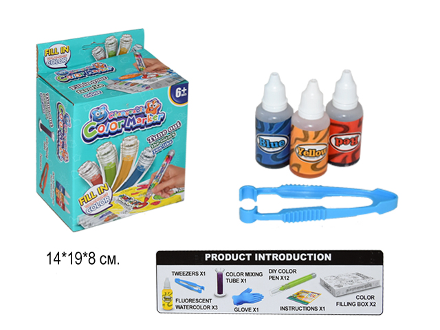 Комплектация: 3 оттенка чернил, мензурка для смешивания цветов, пинцет, перчатки, 12 комплектов деталей для маркеров, картонный пенал-раскраска, наклейки для украшения маркеров, инструкция.