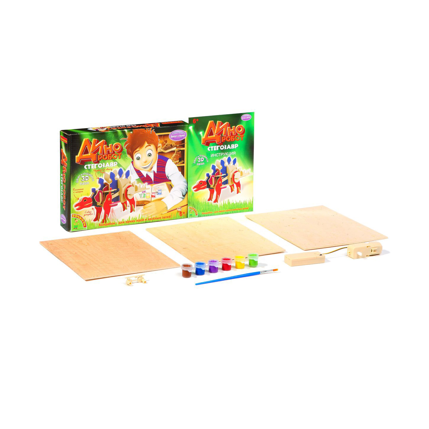 Французское творчество Досуг с Буки BONDIBON, деревян. 3D пазл Стегозавр, арт.D440SВ наборе: 40 деталей, механизм для движения, краски 6 цветов, кисть, наждачная бумага, инструкция с иллюстрациями. Требуются 2 батарейки ААА (не входят в набор).