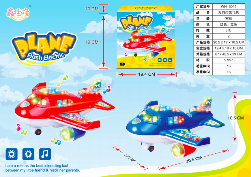 - Самолет арт. 138QS" На батар. в коробке 22*12,5*19,5 /24шт.//бл.12/×Самолет арт. 138QS" На батар. в коробке 22*12,5*19,5 /24шт.//бл.12/Модель самолета представляет собой уменьшенную копию настоящего воздушного судна. Игрушка оснащена подвижными элементами и свето-звуковыми эффектами.