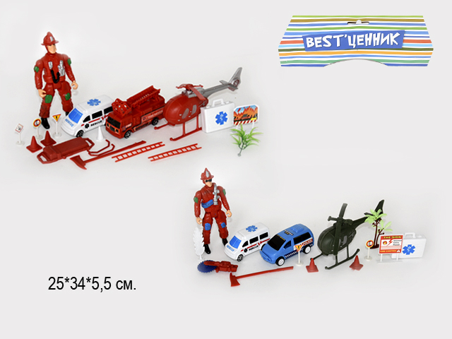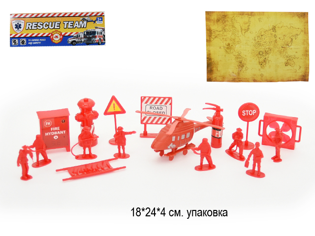В комплекте вертолет, солдатики, носилки, батут, пожарный щит, огнетушитель и многое другое.