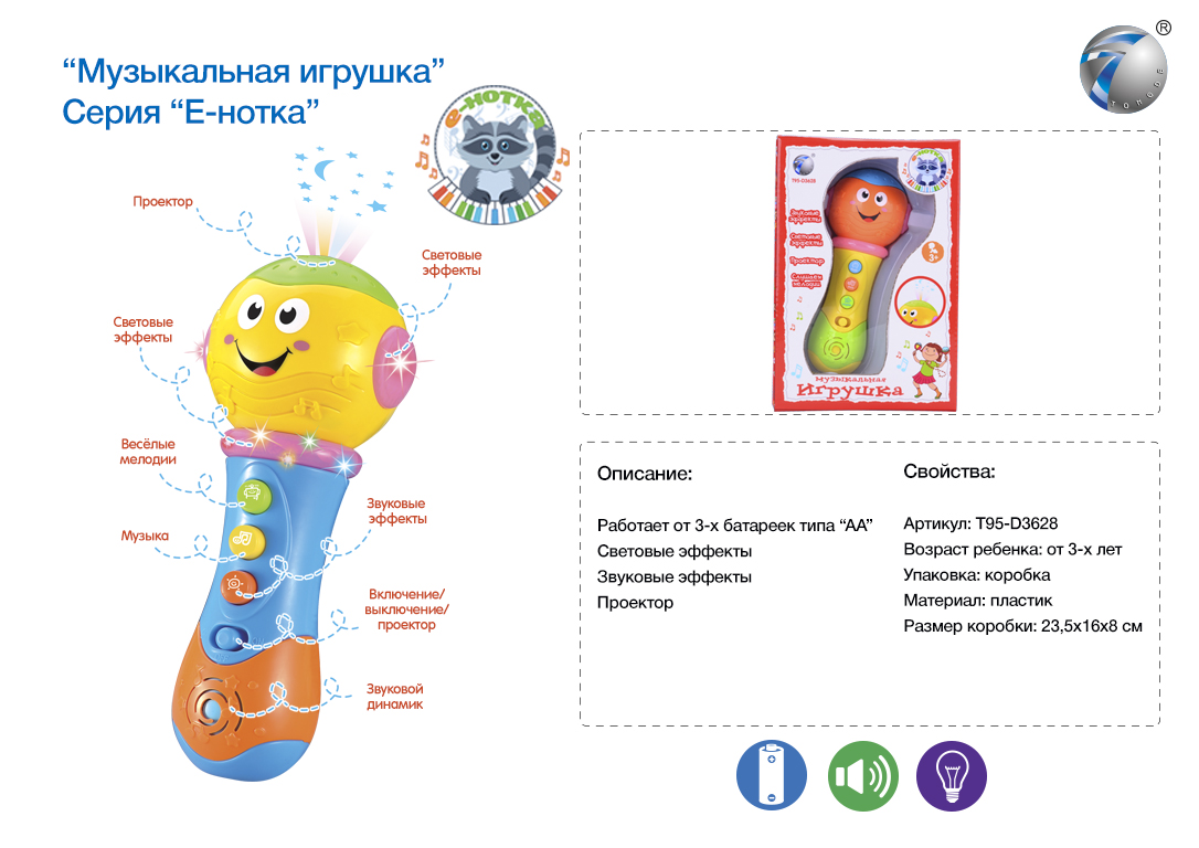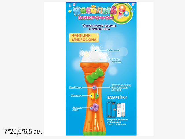 Микрофон арт. 7389" На бат. в кор. 20,6*7*6,5 /72шт.//бл.36/Для включения игрушки нажмите самую верхнюю кнопку на микрофоне. Средние кнопки: одна воспроизводит веселую песенку про алфавит, при нажатии второй кнопки включается микрофон и вы можете говорить в него и петь - Ваш голос будет звучать громко и четко.Самая нижняя кнопка на микрофоне в форме нотки воспроизводит разные мелодии.Все музыкальные фрагменты сопровождаются игрой разноцветных огоньков в верхней части микрофона. Форма микрофона сделана так, что малышу будет удобно держать его в руке и одновременно нажимать на кнопки.