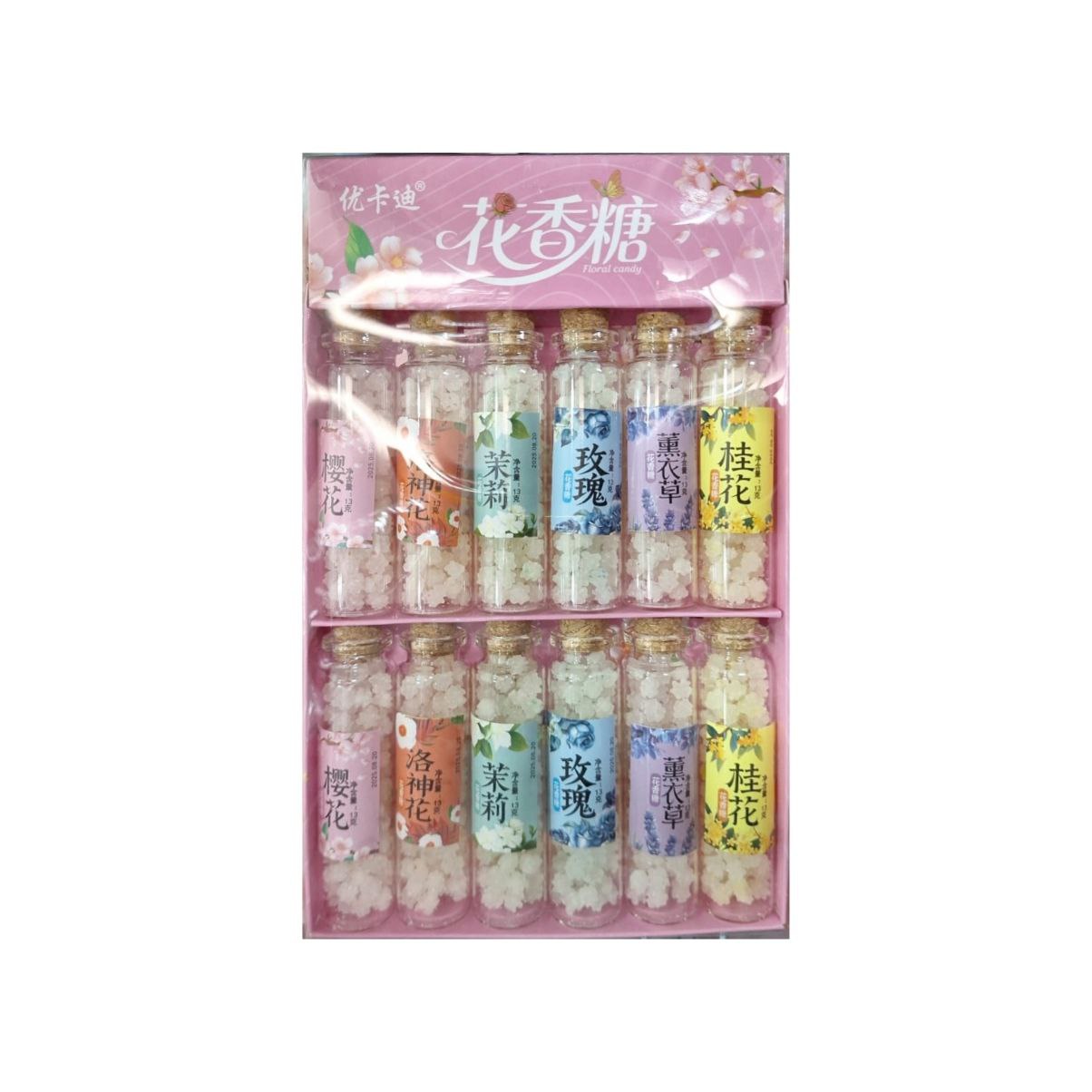 вкусы: османтус душистый (желтый), лаванда (фиолетовый), роза (синий), жасмин (голубой), розель (красный), сакура (розовый)