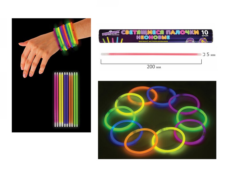 - кс_Палочки-браслеты арт. 662595 Светящиеся (неоновые) ЮНЛАНДИЯ набор 10 шт. в тубе, ассорти×кс_Палочки-браслеты арт. 662595 Светящиеся (неоновые) ЮНЛАНДИЯ набор 10 шт. в тубе, ассортиСветящиеся (неоновые) палочки ЮНЛАНДИЯ отлично подойдут для праздников, вечеринок, концертов и отдыха на природе. Дают неоновое свечение пяти разных цветов. Палочки водонепроницаемые и могут быть использованы в дождливую погоду и даже под водой на небольшой глубине. Светятся до 6 часов. Для активации палочку следует надломить в нескольких местах и тщательно потрясти, чтобы сделать свечение более равномерным. Вставив оба конца палочки в коннектор, можно сделать яркий браслет.