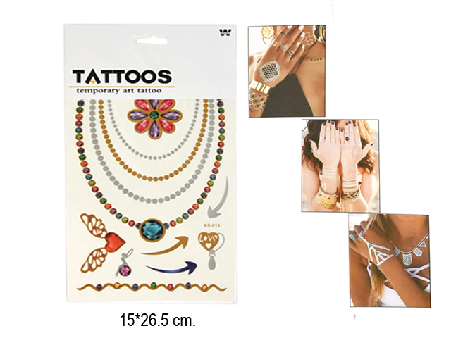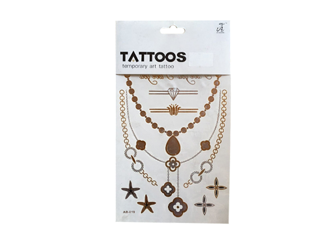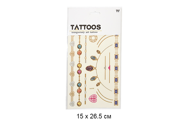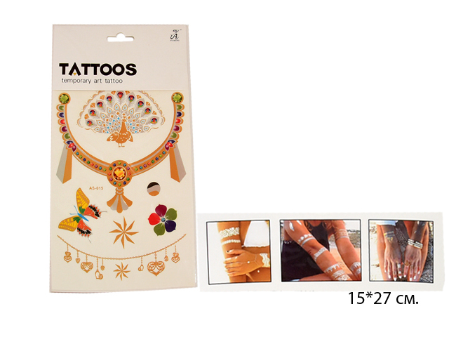 - Набор Тату арт. 2701-027 Колье и браслеты /1200 шт./_×Набор Тату арт. 2701-027 Колье и браслеты /1200 шт./_Модные и яркие тату наклейки на тело, переводные золотистые тату подчеркнут индивидуальность. Переводные татуировки не требуют особенного ухода и не боятся воды. Рисунок продержится дольше, если вы будете избегать трения с одеждой и аксессуарами (часами/сумкой и тп) и не будете наносить на татуировку масла, лосьоны и другие косметические средства. Чтобы снять татуировку, используйте простое масло.20.38 руб. 40.75 руб.