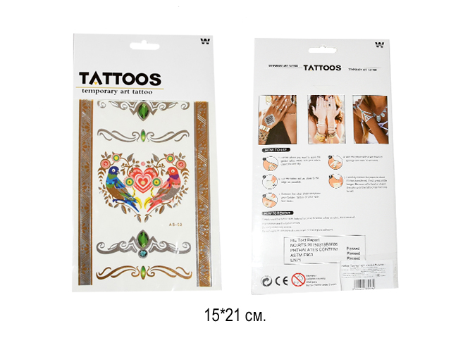- Набор Тату арт. 2701-02 Попугаи /1200шт./_×Набор Тату арт. 2701-02 Попугаи /1200шт./_Комплект из золотистых татуировок - это стильный способ украсить свое тело! Временные татуировки отлично будут смотреться в летние сезоны, когда по максимуму можно наклеить на себя временные тату и подобрать к любому наряду и макияжу. Золотисто-разноцветные временные татуировки легко наносятся и удаляются, очень красиво смотрятся на коже.